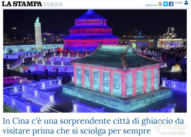 街友们,大家好!今天的la stampa旅游版,登上主页的是谁?是华人街小编第二故乡的黑龙江省哈尔滨市今年的冰雪大世界,看了那么多美爆的照片,看到那么多意大利专栏作家的溢美之词,满满的思乡之情啊!!!