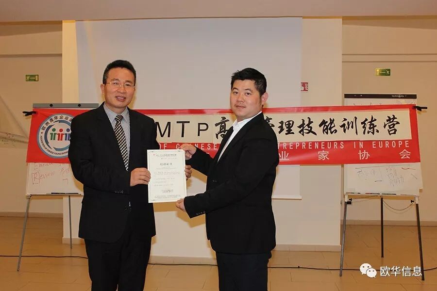 ▲欧洲青年企业家协会第一常务副会长林黎成向郑磊老师赠送纪念品