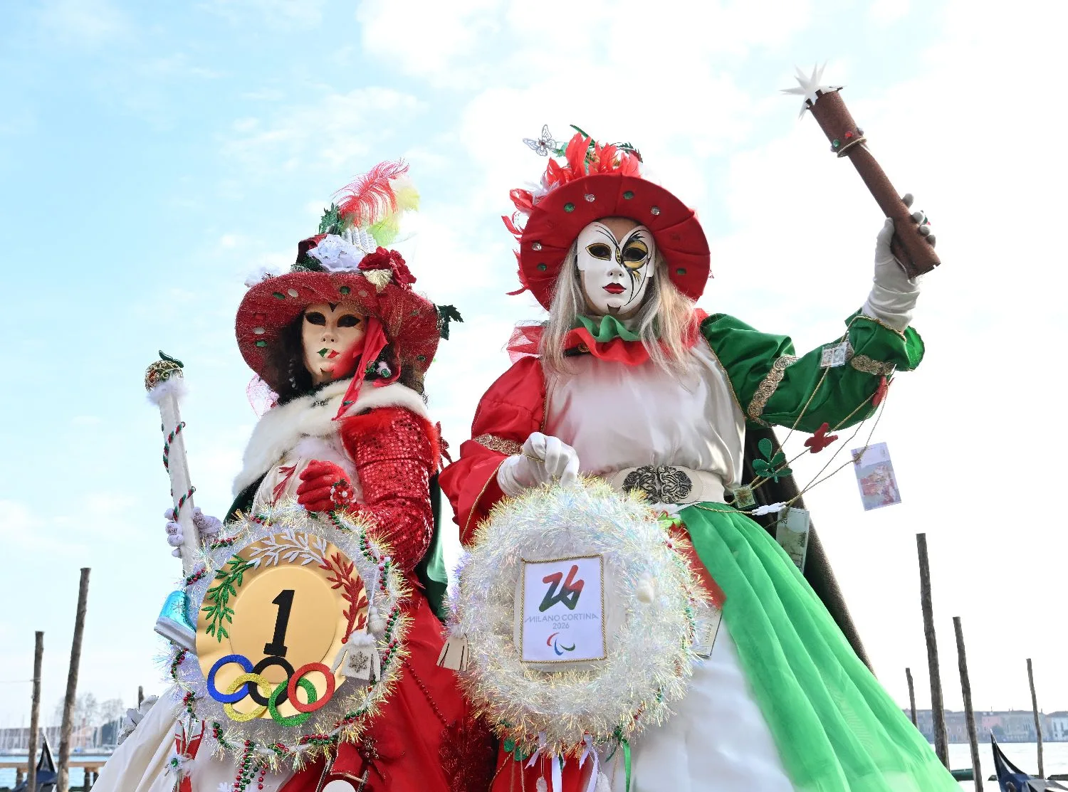 1月31日,在意大利威尼斯,穿着2026年米兰-科尔蒂纳冬奥会主题装扮的狂欢节参与者在圣马可广场摆造型。