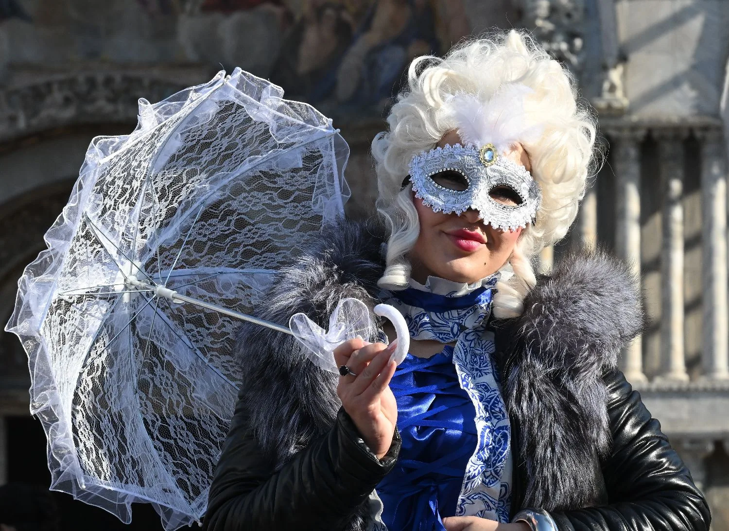 1月31日,在意大利威尼斯,一名狂欢节参与者在圣马可广场摆造型。