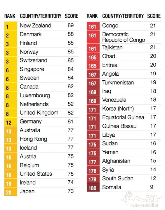 该指数将腐败定义为使用政治力量为组织或私人牟利,而依照表格,新西兰(89)和丹麦(88)是地球上最清廉的国家。而排在末尾的,是被战争摧残的叙利亚和苏丹,还有糟糕的索马里,他只有9分。在这些国家里的非政府组织说,在这里控诉腐败只会招来监狱和子弹。