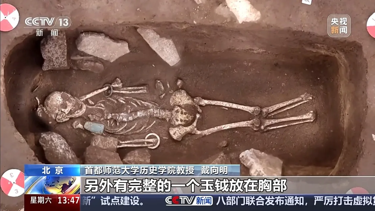 首都师范大学历史学院教授 戴向明:有完整的一个玉钺放在胸部,然后两边手臂上套着玉璧环,这个不是典型红山文化的风格,而是跟它时间地点比较接近的山东海岱地区的大汶口文化,指向世俗的礼制特征。