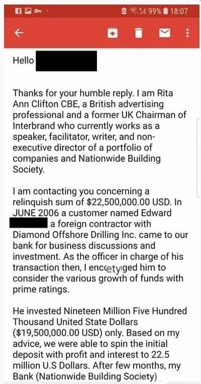 在一个案例中,一名姓“Edward”的老人死后留下了2250万美金的遗产。一名女诈骗犯随即通过社交平台找到另一名姓氏同样为“Edward”的男子,并与之进行了多次交谈。而后,她建议男子去冒充死者的亲侄子,称可以通过一个律师团队合法地继承这笔财产。而作为交换,她则要求得到1000万美金的报酬。