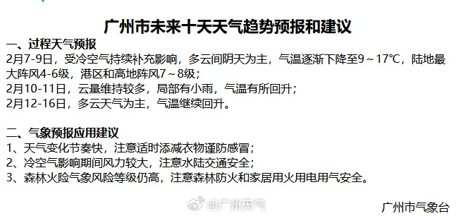 广州市气象台预计,2月8日—9日受冷空气持续补充影响,广州多云到阴天,气温逐渐下降至9~18℃,港区和高地阵风6~8级。2月10日—11日云量维持较多,气温有所回升。