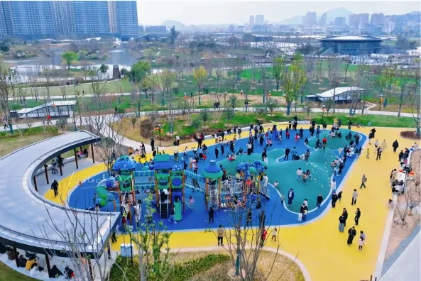 尽管时值冬日,公园却是满目青绿、水流潺潺,一派生机勃勃的热闹景象。市民们携家带口、结伴而来,沿着蜿蜒步道漫步,在亲水平台驻足,于开阔草坪休憩,孩子们在游乐区畅快玩耍,老人们坐在长椅上闲话家常,青年们则用镜头记录下眼前如画的风光。公园的设计没有刻意造景,而是巧妙顺应原有的地形和水系而建,开阔平地与蜿蜒小径相互串联,水面波光潋滟、树木郁郁葱葱,构成一幅高低错落、自然相融的园林长卷,漫步其间,移步换景,尽是悠然惬意与鲜活人气。