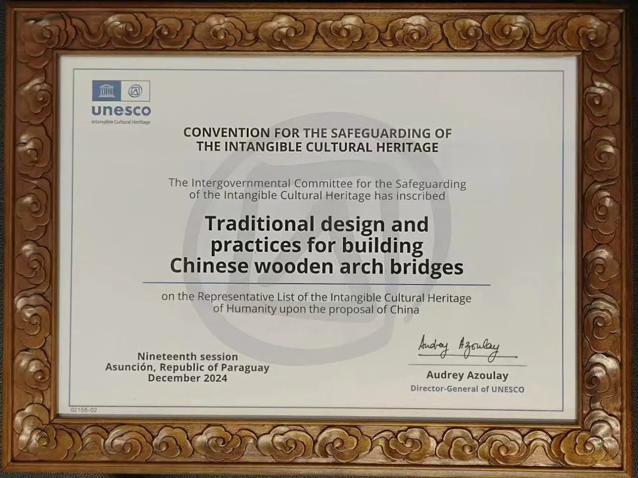 11月22日,在2025年全国非物质文化遗产保护工作会议上举行“转入人类非物质文化遗产代表作名录项目”颁证仪式,文化和旅游部副部长、国家文物局局长饶权为“中国木拱桥传统营造技艺”等3个入选项目颁发证书。