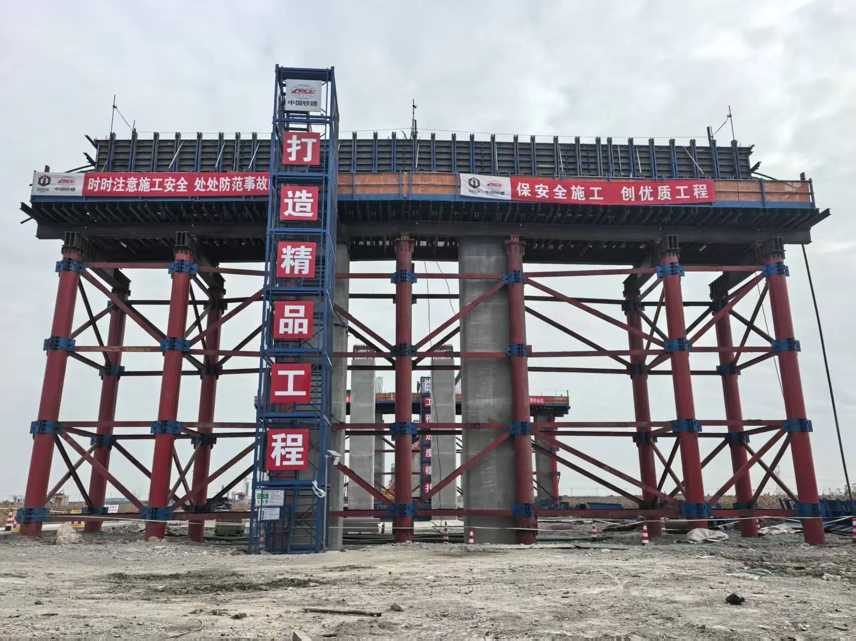 地面之上的挑战同样不小。承台作业区内,钢筋笼如骨架般伫立;墩柱旁,工人们正配合进行钢筋绑扎与支架搭建。一根根13米多高的墩柱拔地而起,待盖梁安装后整体高度接近18米。而即将成型的大悬臂盖梁,更是工地的技术亮点。