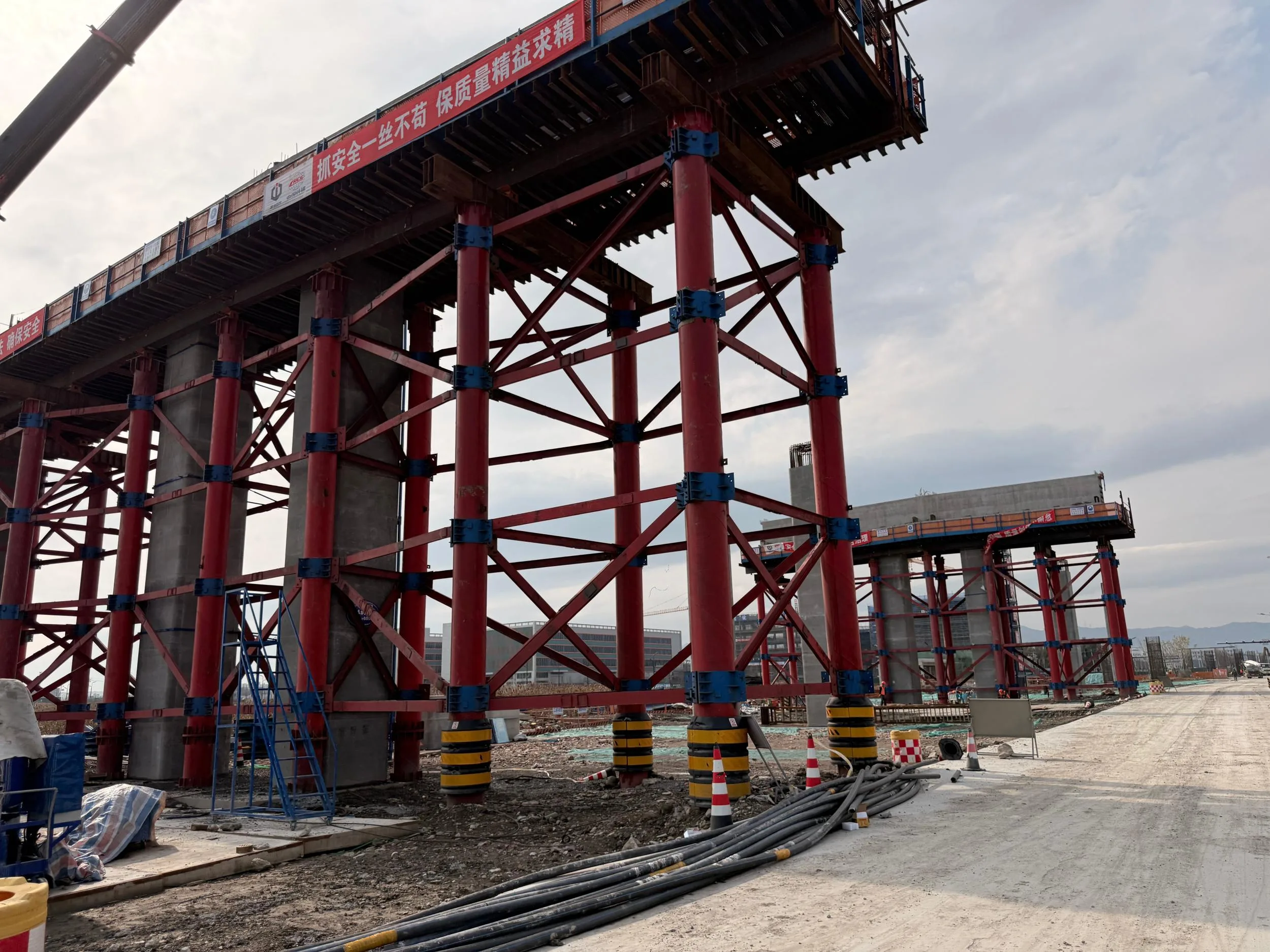 支撑这一庞然大物的,是重达近200吨的大悬臂盖梁支架,单套搭建周期超过半个月。记者在现场看到,纵横交错的钢结构如同“钢铁骨架”托起盖梁。项目负责人指着地上待安装的重型支架说:“这些支架将保障盖梁钢筋绑扎、混凝土浇筑等工序顺利进行。为确保温州湾互通提前建成,我们在优化设计的基础上,进一步加大资源投入,将原计划的3套盖梁支架增至10套,全力提升施工效率。”