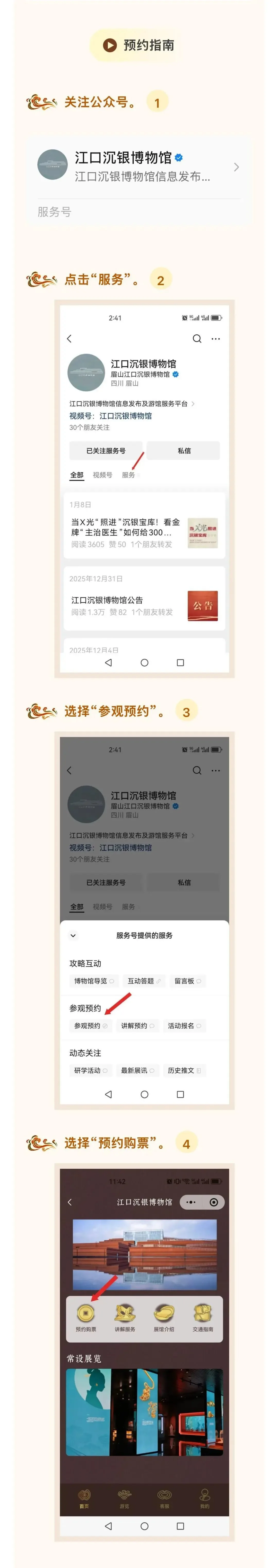 3月6日9:00起通过“江口沉银博物馆”微信公众号实名预约,每日预约名额1000人,约满为止。请凭预约成功的二维码或本人身份证原件,在入口处核验入馆。
