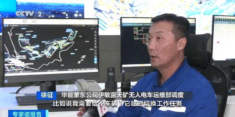 华能蒙东公司伊敏露天矿无人电车运维部调度 徐征:比如我需要给矿卡临时切换工作任务,想从一个点转移到另一个点,在平台上就可以按秒级速度来进行快速的操作。不像传统工地那样需要对讲来呼唤应答,减少了沟通的层级、指令的偏差。