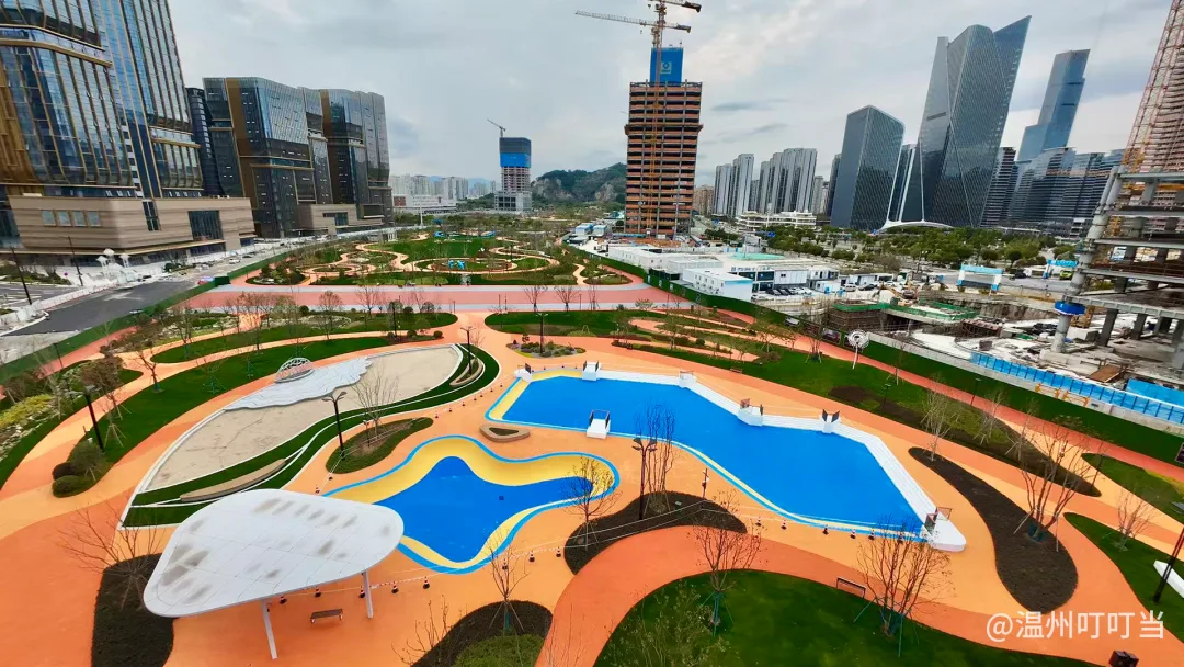 这条开放时间还没“满月”的绿廊,是温州CBD最大的公园,长约1.5公里,占地97970平方米,一头连着瓯江,一头连着杨府山,设有多重景观节点与全龄友好设施。