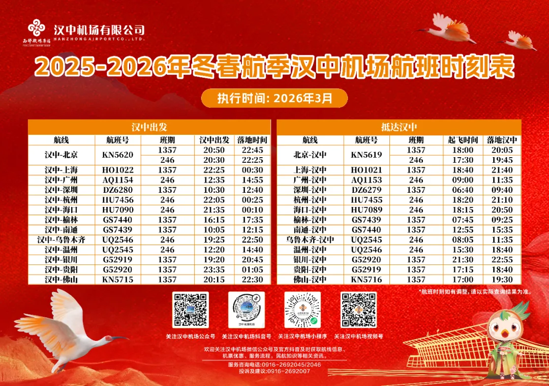 您的位置 > 首页 > 国内 汉中直飞!又一新航线即将开通! 来源: 陕西交通广播 | 2026-03-06 | 👁:6 好消息! 汉中 ⇌ 厦门新航线 将于3月31日正式首航 ! 航班信息 汉中⇌厦门 航班号:G54759/4760 华夏航空执飞 班期:每周二、四、六 航班时刻及价格请以实际查询结果为准 来源:汉中日报、汉中城固机场 标签: 暂无标签 上一篇 镜观中国丨立生态环境法典 谱美丽中国新篇 ❤️ 赞一个 (0) 🔗 分享 用户评论 (0) 暂无评论,快来抢沙发吧!首评可提升互动曝光。 请 登录 后参与互动