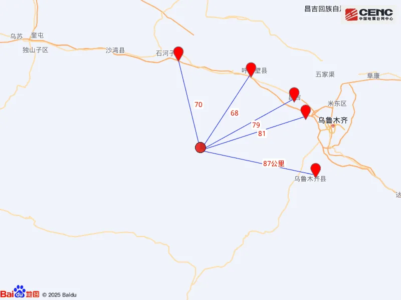 周边县城:震中距呼图壁县68公里、距玛纳斯县70公里、距昌吉市79公里、距头屯河区81公里、距乌鲁木齐县87公里,距石河子市76公里,距乌鲁木齐市99公里。