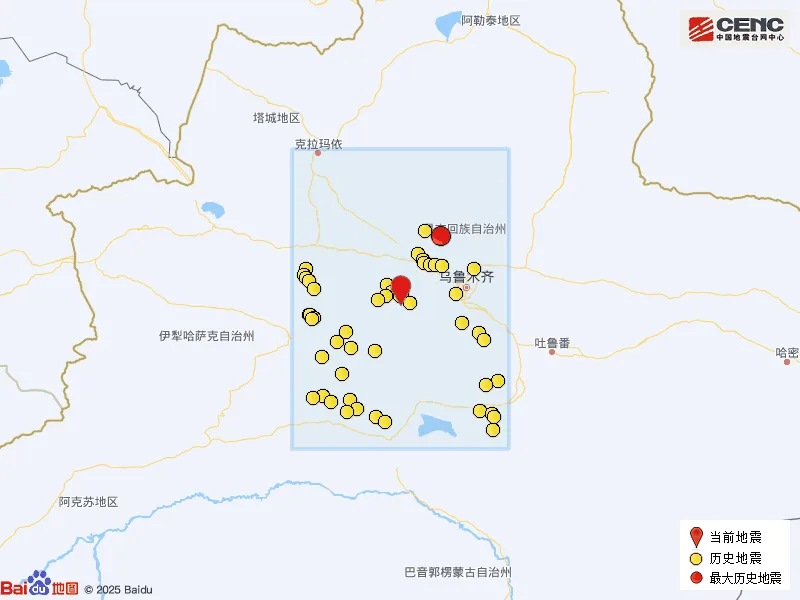 历史地震:根据中国地震台网速报目录,震中周边200公里内近5年来发生3级以上地震共62次,最大地震分别是2026年3月7日在新疆昌吉州呼图壁县发生的4.8级地震(距离本次震中NAN公里)和2022年7月20日在新疆昌吉州昌吉市发生的4.8级地震(距离本次震中106公里),按震级大小前50次历史地震分布如图。