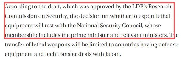 据日本媒体此前报道,根据自民党安全保障调查委员会批准的草案,是否出口致命性武器装备的决定权将归国家安全保障会议所有,其成员包括首相和相关阁僚。