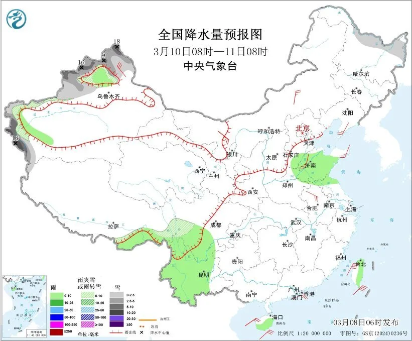 图2 全国降水量预报图(3月9日08时-10日08时)