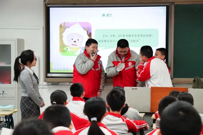 课堂伊始,郑爰彤与学生共同制定“尊重他人、认真倾听”公约。热身环节的绘画接龙游戏迅速点燃热情,各小组在欢声笑语中快速融入“羊村守护者”角色。