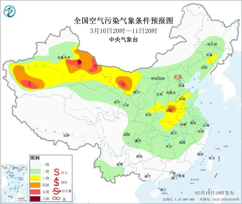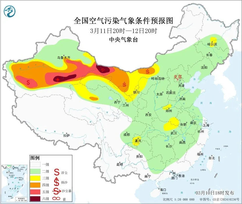 未来一周,全国大部地区大气扩散和湿清除条件较好,无持续性霾天气。11日至13日,受冷空气大风影响,新疆东部和南部、内蒙古西部、青海北部、甘肃西部、宁夏等地有沙尘天气。中央气象台于3月10日18时发布沙尘暴蓝色预警,预计10日20时至11日20时,新疆东部和南部、内蒙古西部、甘肃西部等地的部分地区有扬沙或浮尘天气,其中,新疆东部、内蒙古西部、甘肃西部局地有沙尘暴或强沙尘暴。