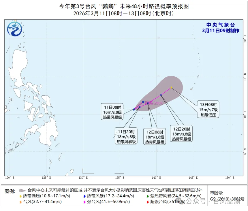 3月11日8时,今年第3号台风“鹦鹉”的中心位于北纬10.7°,东经136.9°(距离美国关岛西偏南方向约910公里),中心附近最大风速18米/秒(8级风,热带风暴级),中心最低气压998百帕。