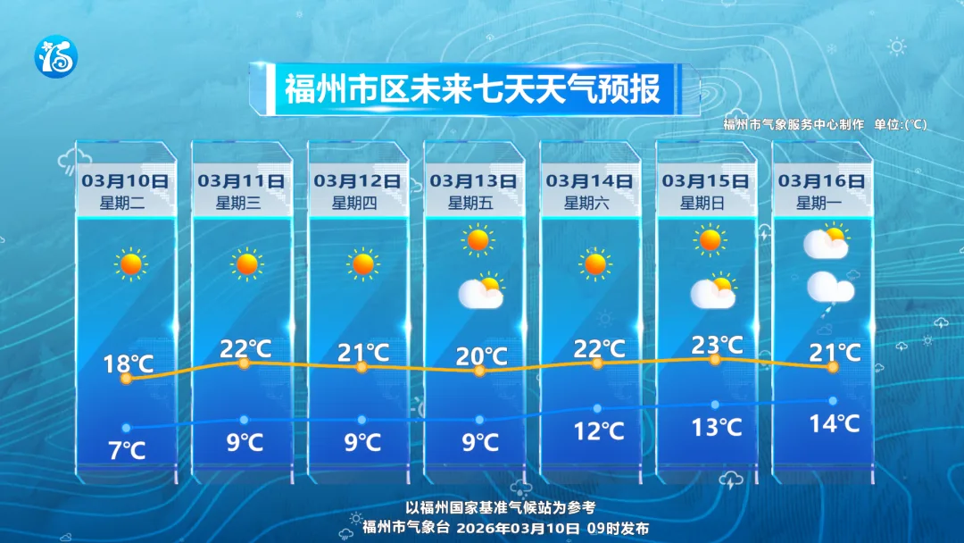 未来三天,福州整体以晴到多云为主,阳光“在线”、能见度佳,非常适宜户外活动与洗晒。气温整体平稳,市区日间最高气温在20~22℃,暖意舒适;但受晴空辐射影响,夜晨最低气温仅7~9℃,昼夜温差接近12℃,是典型的“早晚凉、白天暖”格局。