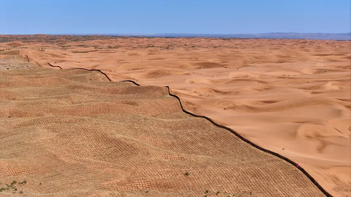 2025年6月30日在宁夏中卫市长流水村拍摄的腾格里沙漠东南缘治沙锁边工程现场(无人机照片)。新华社记者 王鹏 摄