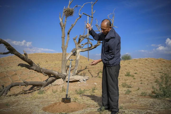 2023年7月19日,中卫市西郊林场场长唐希明在栽种技术处理过的灌木苗,进行夏季雨季造林试验。新华社记者 冯开华 摄
