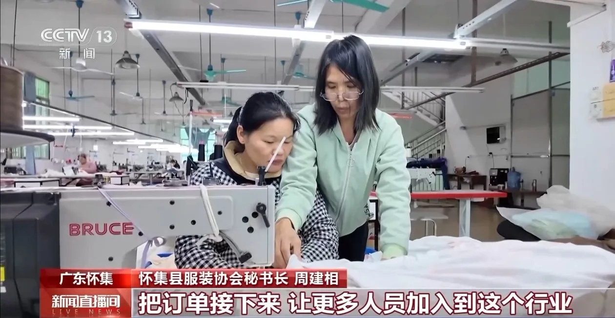怀集县服装协会秘书长 周建相:我们跟政府一起去一些跨境电商的头部公司对接,跨境电商的公司就承诺今年内会给我们接近10个亿的订单。我们现在在引导加工厂迅速发展,把订单接下来,让更多人员加入这个行业。