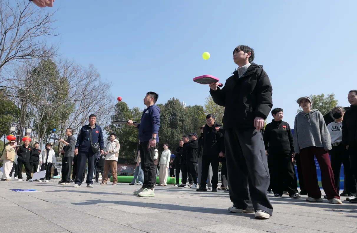 率先开赛的颠球接力项目瞬间点燃现场氛围。参赛者们手持球拍,屏息凝神紧盯上下翻飞的小球,手腕灵活发力,稳稳控制球感。每一次平稳颠起、每一次顺利交接,都牵动着场边观众的心,加油声、喝彩声此起彼伏。
