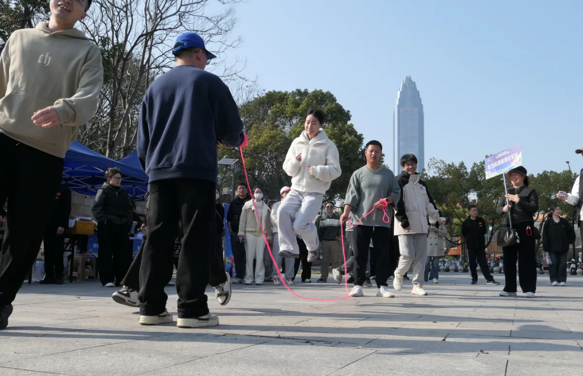 八字跳绳项目则考验团队的配合节奏与协作默契。摇绳队员挥动长绳,绳索在空中划出整齐圆弧,跳绳选手找准时机依次鱼贯而入,步伐紧凑、衔接流畅。短短数分钟的比拼,不仅展现了团队配合能力,更在一来一往间拉近了邻里距离。