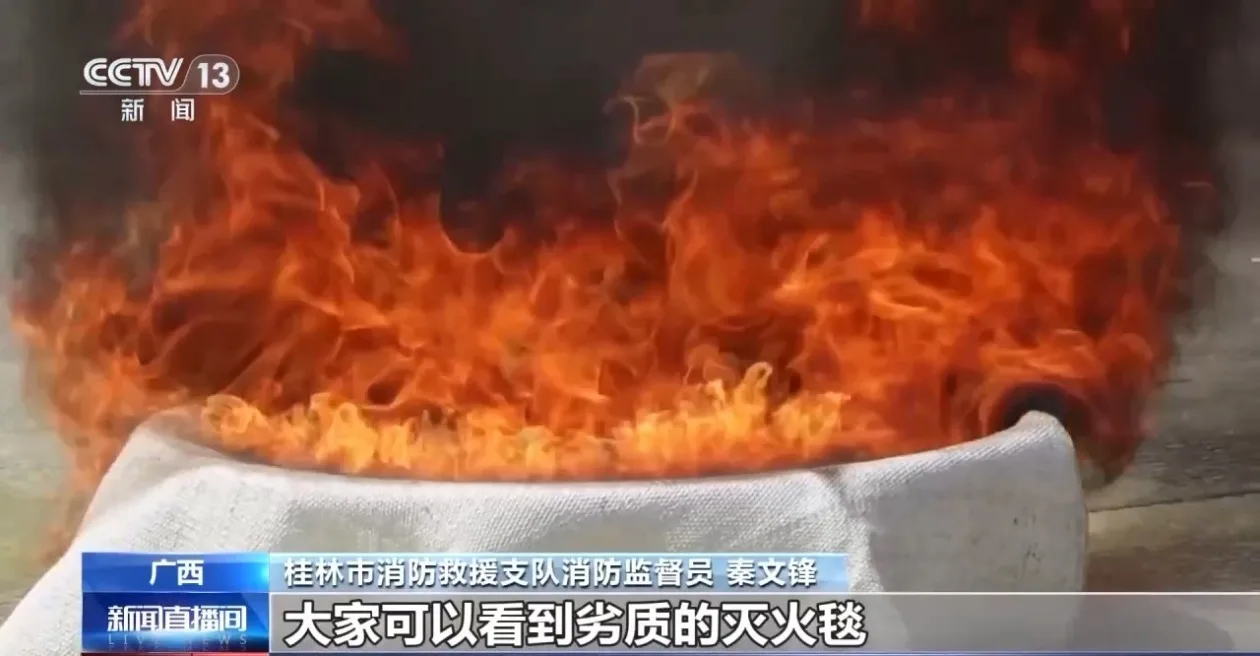 桂林市消防救援支队消防监督员 秦文锋:劣质的灭火毯盖在油盘上被烧穿了,达不到灭火的效果。