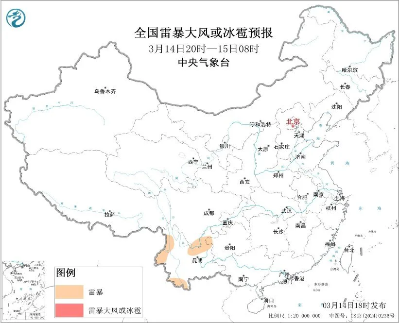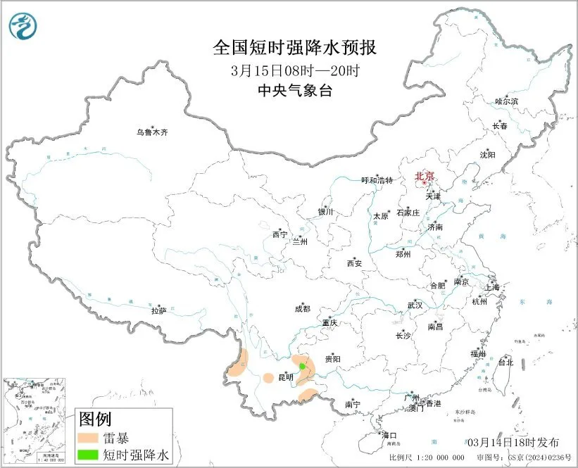 预计3月14日20时至15日20时,云南东北部部分地区将有短时强降水天气,小时雨量20-30毫米,局地可达30毫米以上。