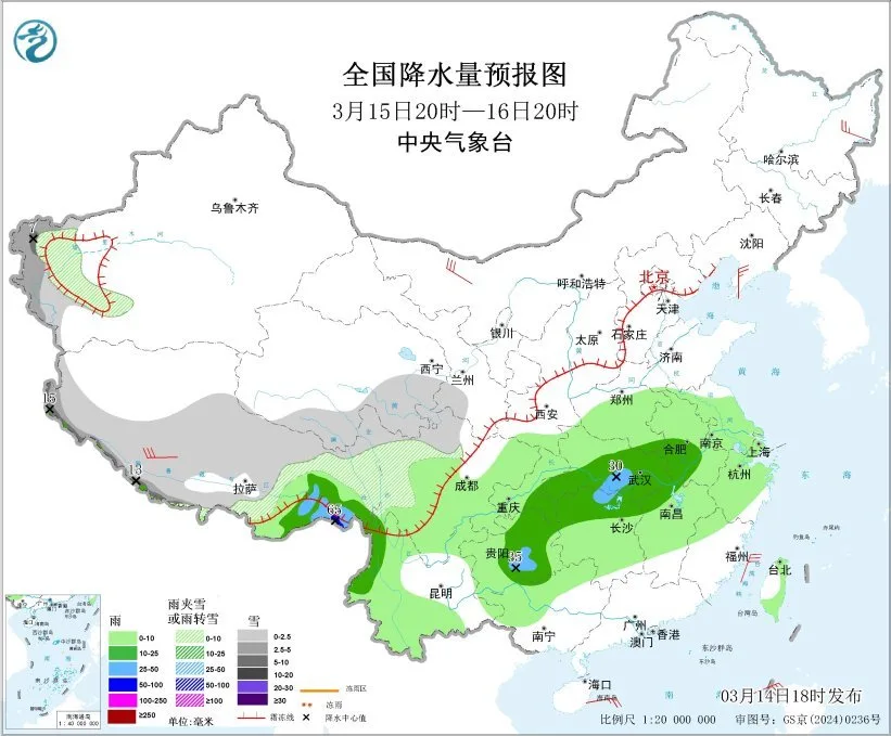 3月14日20时至15日20时,内蒙古东北部、黑龙江西北部、新疆南疆西部山区、西藏大部、川西高原、青海东部、甘肃南部、秦岭山区、山西南部、山东西北部等地部分地区有小雪或雨夹雪,其中,西藏西南部局地有中到大雪(5~8毫米);西藏东南部、四川南部和东部、云南、贵州、重庆、湖北、湖南中北部、陕西东南部、河南大部、山东中南部、安徽中部等地部分地区有小到中雨,其中,西藏东南部、贵州东北部、重庆南部和东北部等地局地有大雨(25~40毫米),西藏东南部局地有暴雨(50~70毫米)。内蒙古中东部、黑龙江西部、山东半岛等地部分地区有4~6级风,西藏西部部分地区有7~8级风;巴士海峡、南海东北部和中东部海域有6~7级风,阵风8级(见图1)。夜间至早晨,河北中南部等地部分地区有大雾。