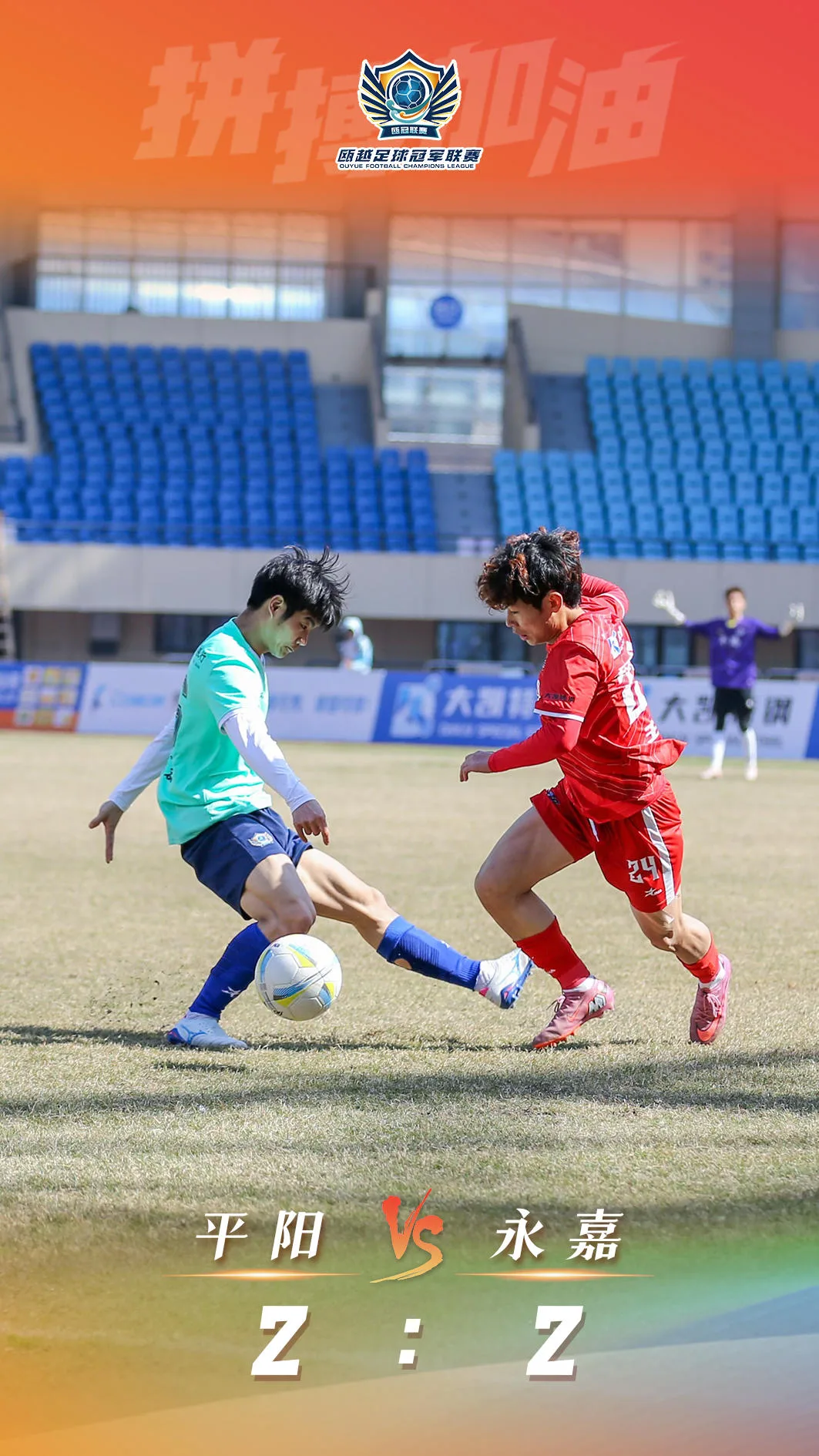 下半场,双方互不相让,拼抢激烈。第67分钟,永嘉队15号戚家宁前场右路接队友长传后传中,7号朱伟中路根据推射得手,2比1,永嘉队反超比分,朱伟上演梅开二度。就在比赛即将进入伤停补时阶段,平阳队进球了,扳平比分的依然是28号曾平豪,当时他在大禁区线外突施冷箭,打出一脚地滚球破门,2比2,与永嘉队朱伟一样,曾平豪本场也实现梅开二度。最终,平阳队主场以2比2与永嘉队握手言和,各取1分。