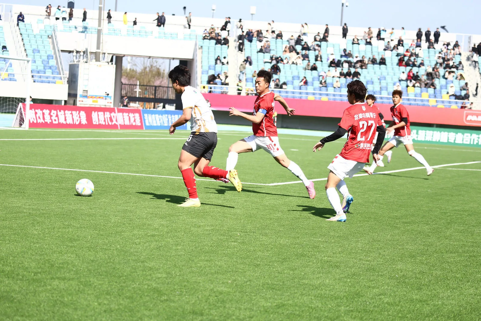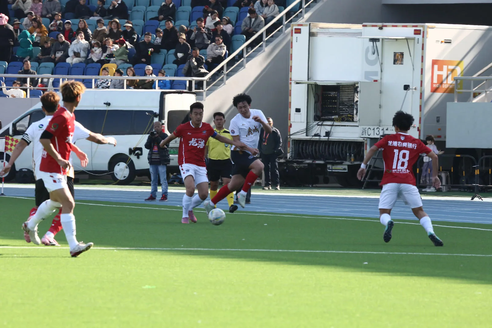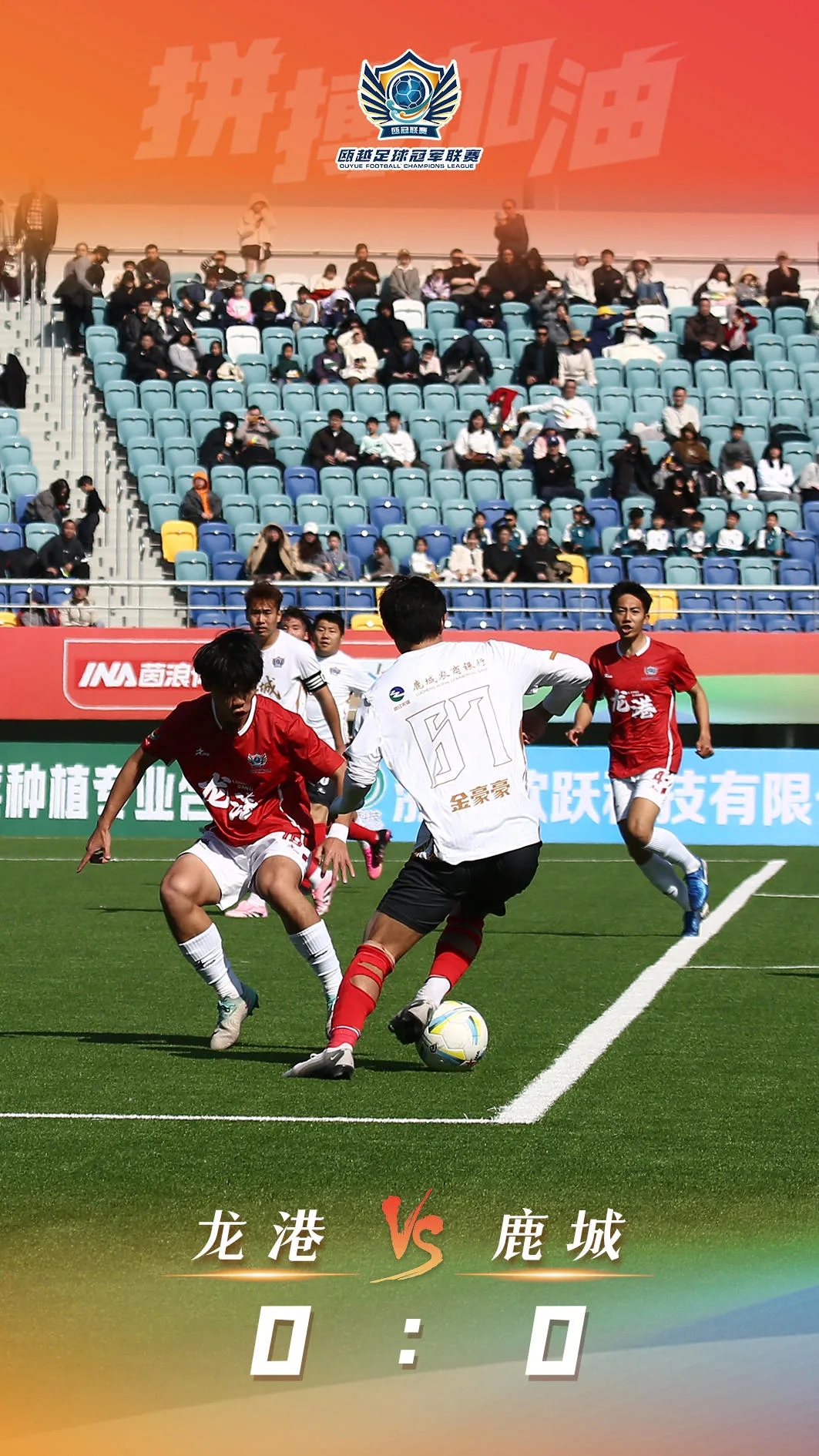 龙港队在龙港体育中心体育场主场对阵鹿城队,比赛踢得一波三折。当天球场看台上吸引了8000余名观众现场观赛,在主场球迷的助威下,龙港队占据主动。第26分钟,龙港队进攻三连击洞穿了鹿城队球门,33号陈永杰左路下底传中,中路的27号林赏赐第一脚打门被后卫挡回,18号林宗孟第二脚远射,鹿城队门将扑球后,皮球击中横梁弹回,30号陈宇第三脚射门终于得手。不过,主裁判在观看了视频回放后,确认陈永杰在传球前,故意手球犯规,因此龙港队进球无效,双方重回同一起跑线,鹿城队逃过一劫。上半场,占尽主场优势的龙港队与鹿城队战成0比0。
