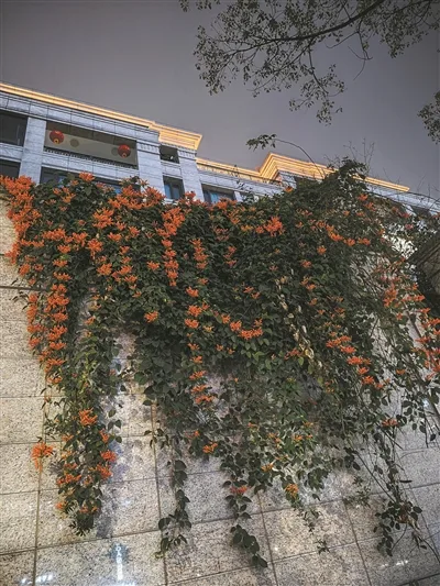 “太惊艳了,路过根本挪不开眼!”李女士家住市区白麓城大悦墅,她在一次晚饭后散步时,被一面“花瀑”惊艳到了。当时,她和家人在小区外面的人行道漫步,转角进入温州大道时蓦然回首,意外发现一面“花瀑”。那橙红色的花朵成串生长,在夜间暖黄灯光的映照下显得格外艳丽。这种花外形很像鞭炮,因此也被称为“炮仗花”。