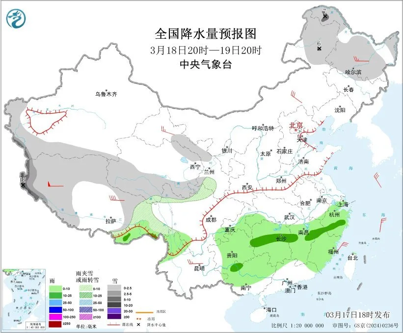 图1 全国降水量预报图(3月17日20时-18日20时)
