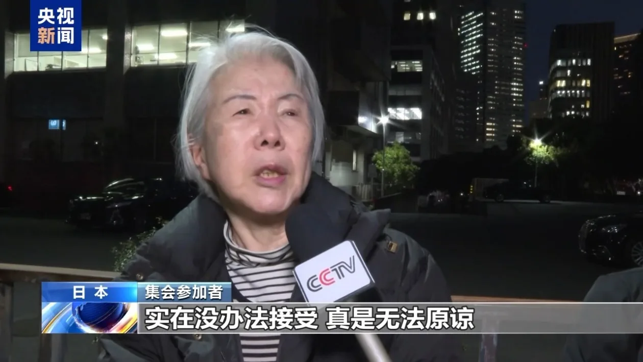 集会参加者:我认为必须和中国搞好关系。对于高市不撤回涉台错误言论这件事,我实在没办法接受,真是无法原谅。