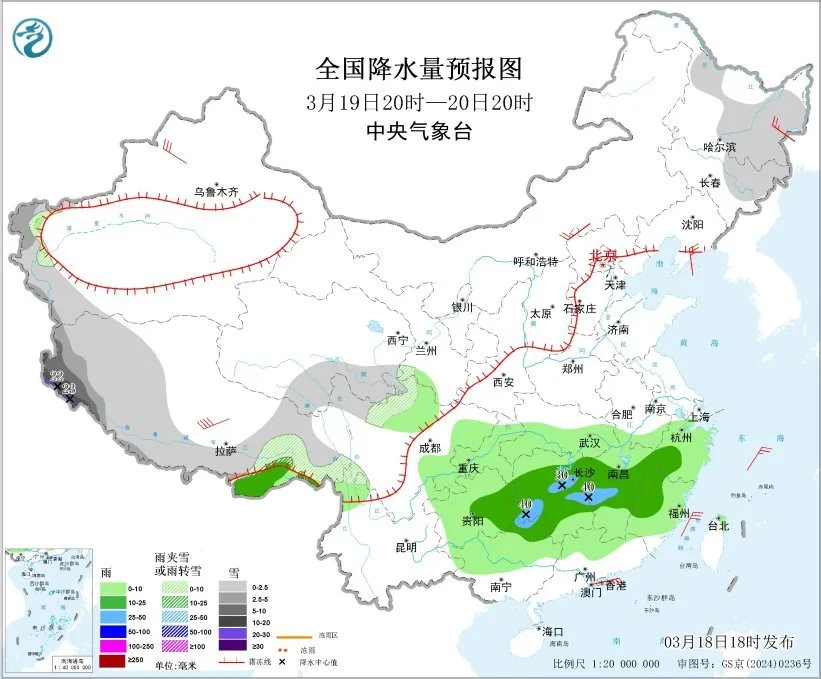 3月19日20时至20日20时,新疆南疆西部山区、青海南部、西藏西部和东北部、黑龙江东部、川西高原西北部等地部分地区有小到中雪或雨夹雪,其中,西藏西部有大到暴雪,局地大暴雪(10~23毫米);浙江西南部、福建西北部、江西中北部、湖南中北部、贵州东部、广西北部、西藏东南部等地部分地区有中到大雨。内蒙古中西部、黑龙江东部、辽宁南部、新疆北部、西藏南部等地部分地区有4~6级风;台湾海峡有5~6级风、阵风7级(见图2)。