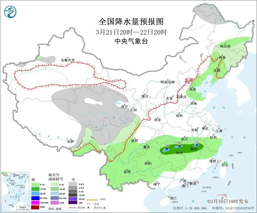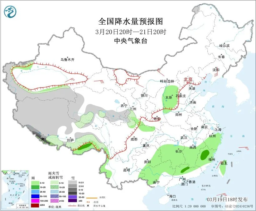 图1 全国降水量预报图(3月19日20时-20日20时)