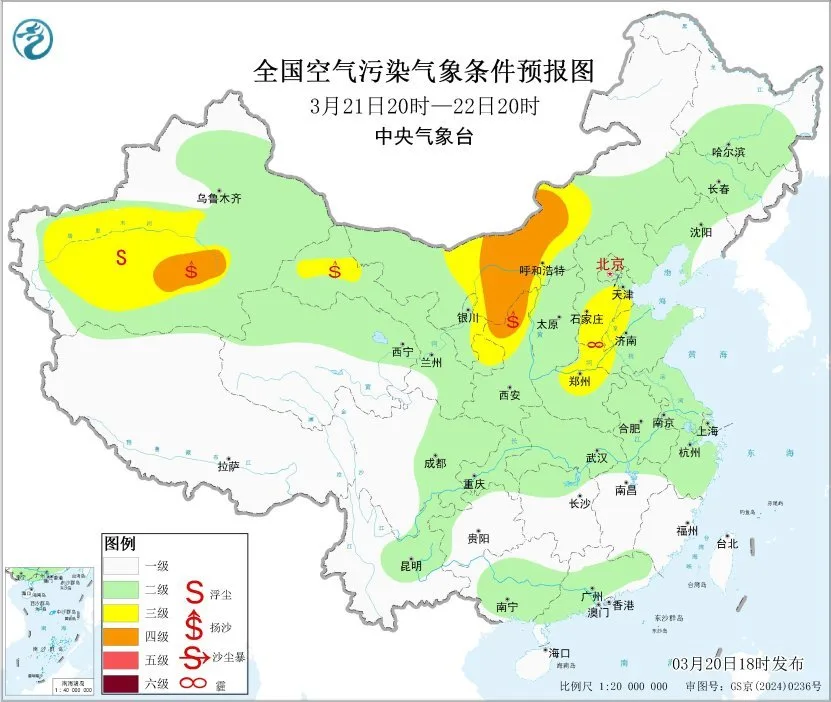 20日夜间至21日上午,山东东部、江苏北部、安徽南部、湖北中东部、湖南中北部、江西北部等地的部分地区有大雾,局地有能见度不足200米的强浓雾。此外,20日夜间至22日,新疆东部和南部、内蒙古中西部、宁夏、甘肃中西部等地的部分地区有扬沙或浮尘天气。