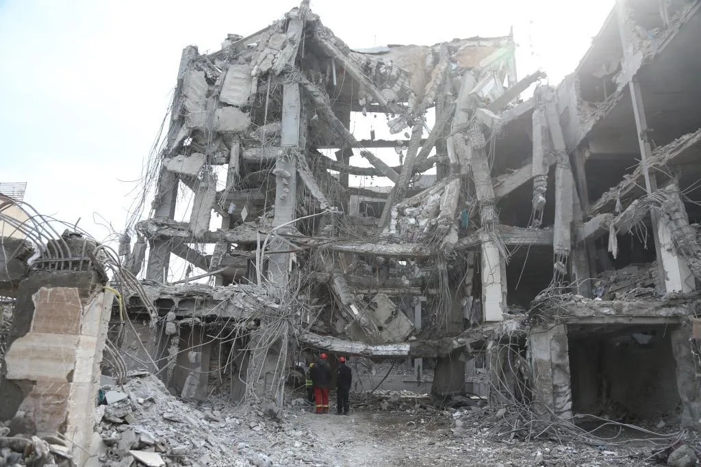 3月12日,在伊朗首都德黑兰,救援人员在受损建筑前工作。新华社记者沙达提摄