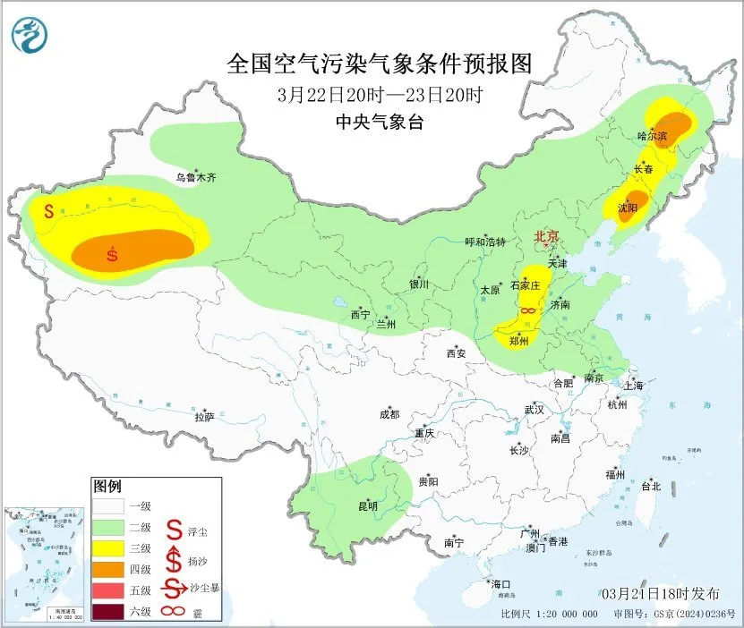 21日夜间至22日上午,华北东部、黄淮东部、东北地区大部有轻度霾,部分地区有中至重度霾;河北中部、天津大部、山东东部沿海、江苏北部、安徽北部、湖南北部等地的部分地区有大雾,局地有能见度不足500米的浓雾;22日中午起,受冷空气影响,上述地区雾霾天气逐渐减弱消散。此外,21日夜间至22日,新疆南部、内蒙古西部、宁夏中北部、甘肃中部、青海西北部等地的部分地区有扬沙或浮尘天气。