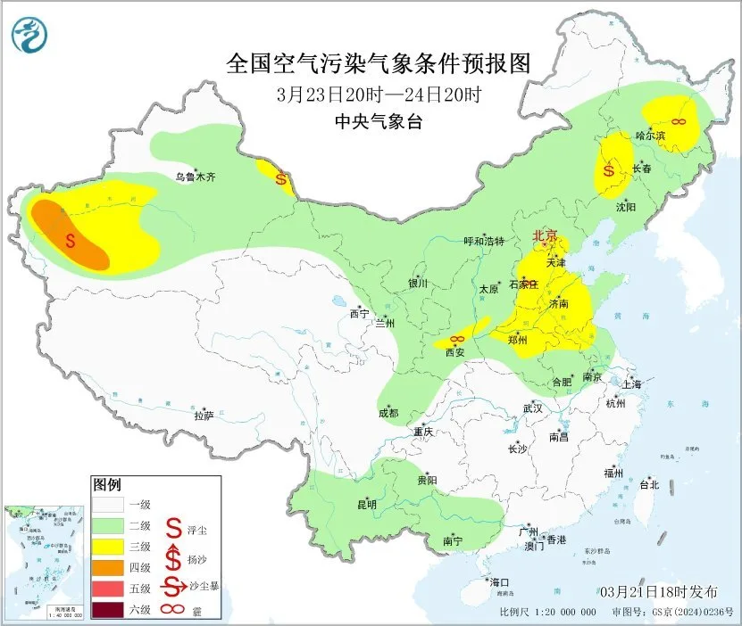 21日夜间至23日,区域南部大气扩散一般,陕西关中地区有短时轻度霾,24日起,受降水天气影响,上述地区大气扩散和湿清除条件逐渐好转,无明显霾天气。