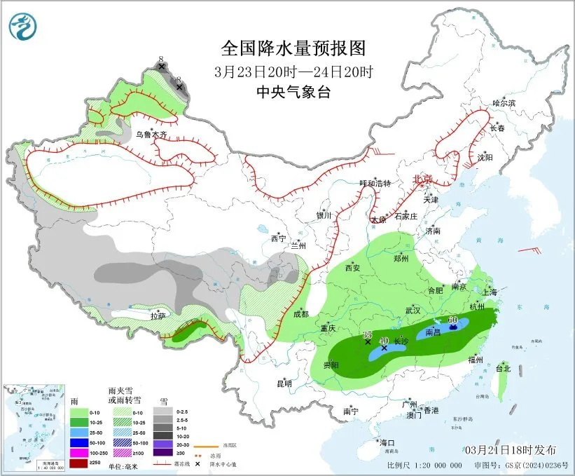 3月23日20时至24日20时,新疆北部高海拔山区和西南部、西藏大部、青海南部、川西高原中北部、甘肃南部等地部分地区有小到中雪或雨夹雪,其中新疆北部高海拔山区有大雪(5~8mm)。湖南中部、江西中北部、浙江中南部、福建西北部、广西北部、贵州中东部、西藏东南部等地部分地区有中到大雨,其中,江西东北部等地部分地区有暴雨(50~60mm)。内蒙古中部等地部分地区有5~6级风(见图3)。