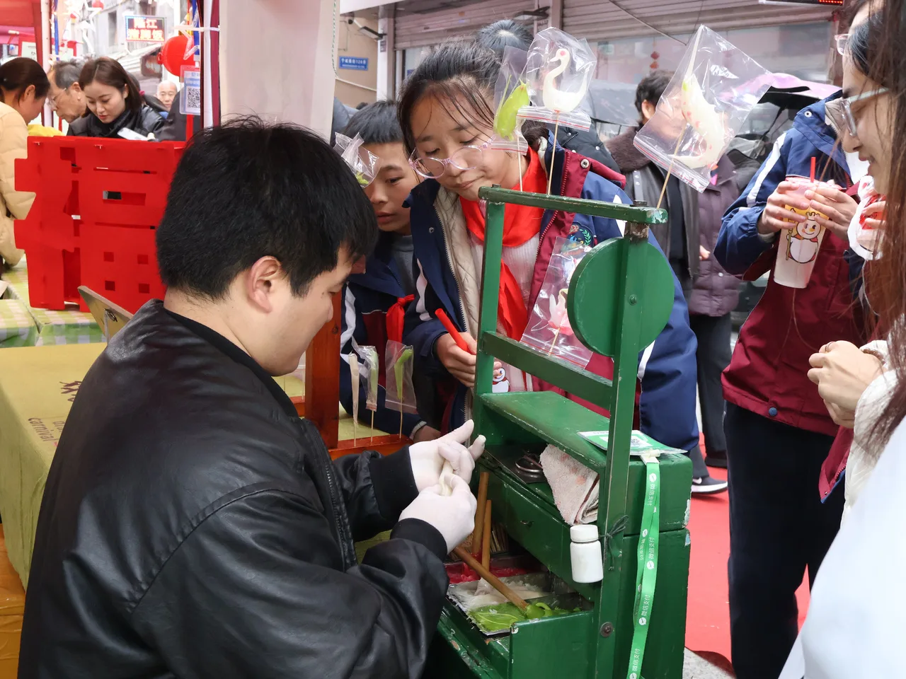 长达500余米的宁村横街,在3月20日化身为“民俗长廊”。祈福、美食、非遗、表演、打卡、游戏六大区域错落有致,90余个摊位一字排开。灯盏糕、九层糕、岩衣胶冻;温州鼓词、拼字龙灯、非遗米饼……烟火气与文化味在这里深度交织,全景式展现龙湾深厚的非遗底蕴。