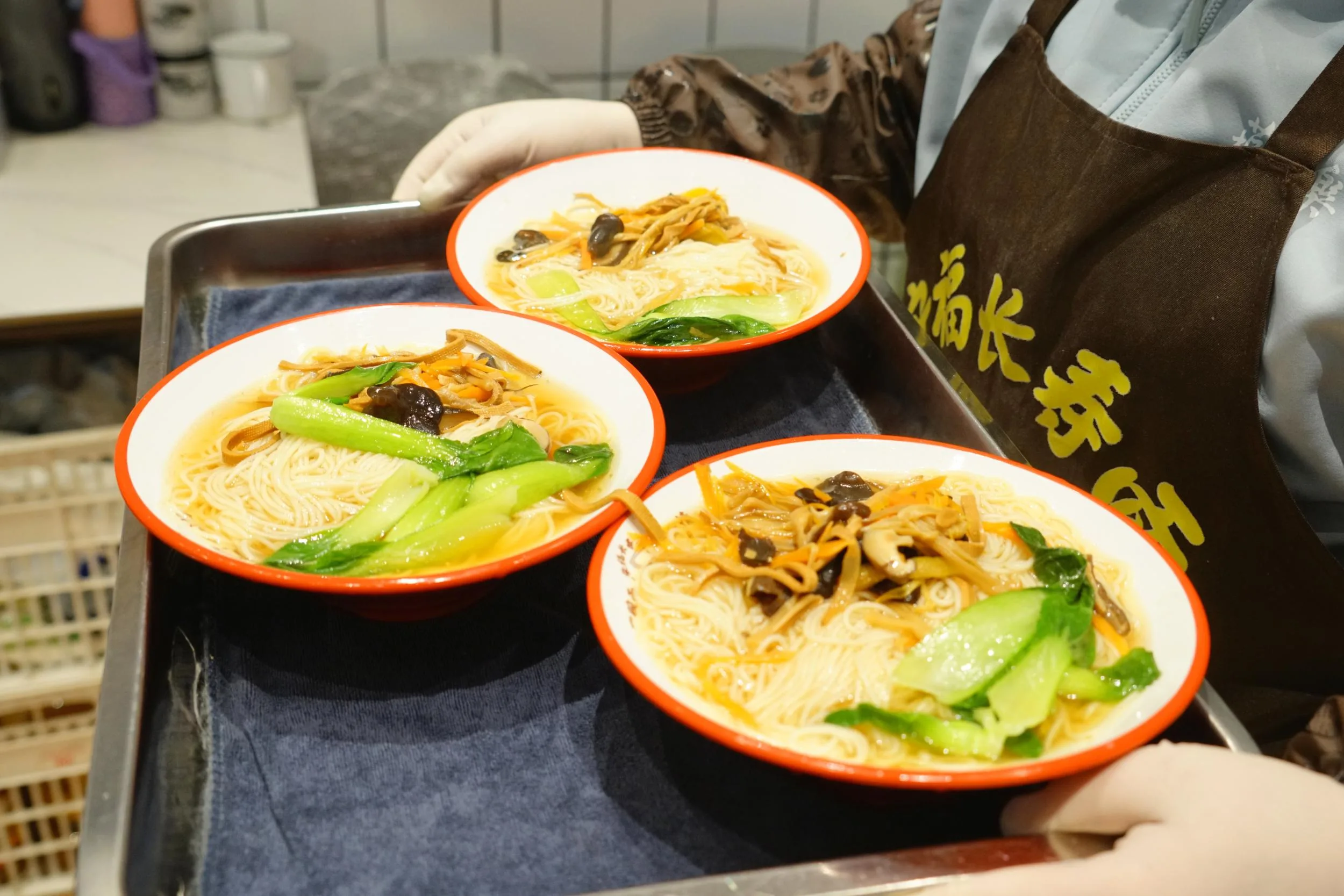“当时鹿城的公益爱心亭多是施粥、送茯茶、做小吃,很少有提供面条的。我儿子说,这么好吃的面只有在庙会才能吃到,太可惜了。”正是这句不经意的话,点醒了温金燕,让她下定决心回温州开一家公益面馆。想法一出,老友们纷纷响应。选址装修、组织义工,不到一个月——去年4月,安福长寿面馆便在松台山脚下热闹开张。附近老人、环卫工人、保安大叔、外卖小哥、医院护工……只要走进面馆,都能免费享用这碗热面。