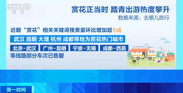 清明假期,踏青出游热度不断攀升,数据显示,近期“赏花”相关关键词搜索量环比增加超6成。武汉、昆明、大理、杭州、成都等地,成为赏花热门城市。