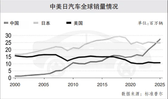【环球时报记者 杨沙沙 环球时报特约记者 王辉】《日本经济新闻》网站21日报道,在2025年全球新车销量排名中,中国汽车品牌的整体销量超越日本车企,夺得“全球冠军”。中国汽车的全球整体年销量同比增长10%,接近2700万辆;日本车企销量则略有下降,为2500万辆左右。这是自2000年以来,日本汽车行业首次丢掉全球销量第一的宝座。比亚迪、吉利分别在榜单中位列第6和第8位,成为中国品牌的销量冠军与亚军。