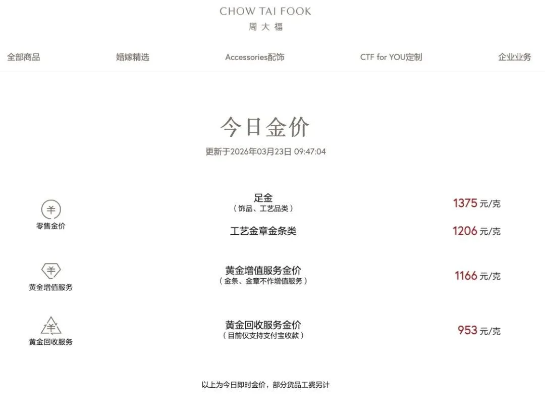 周生生足金饰品报1367元/克,较21日下跌22元。