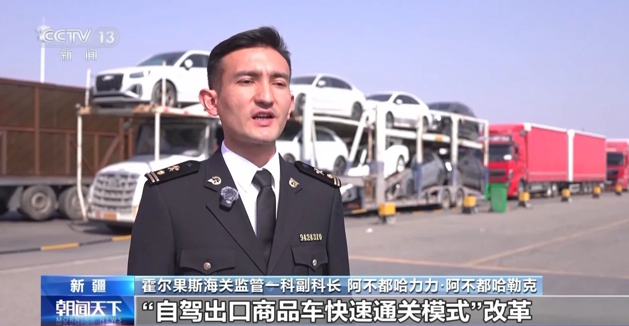 霍尔果斯海关监管一科副科长 阿不都哈力力·阿不都哈勒克:我们积极推广“自驾出口商品车快速通关模式”改革,同时指导企业利用中欧班列、笼车载运等形式出口商品车,为企业提供多种通关选择,助力国产商品车加速出口。